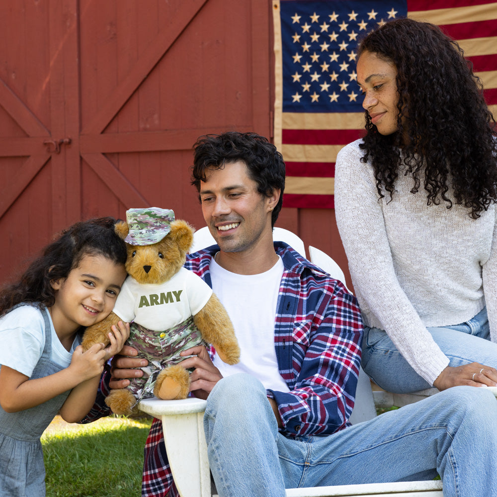 Honor the bravery, dedication, and sacrifice of someone you love with a Bear that stands for so much more than cuddles. This heartfelt tribute is dressed in a military-inspired outfit featuring camo pants, a matching hat, and a customizable T-shirt that proudly displays the branch of the military your loved one serves in—or has served. Whether you're celebrating a homecoming, marking a milestone, or remembering someone dear, this Bear is a powerful symbol of love, gratitude, and unwavering pride.