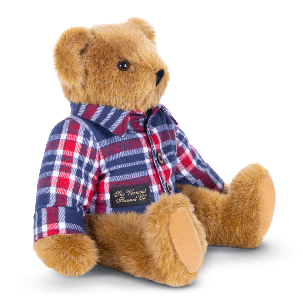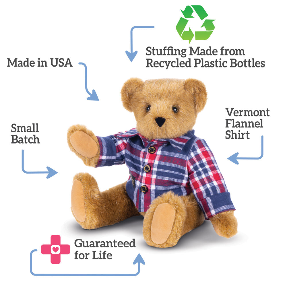 Vermont Flannel and Vermont Teddy Bear have joined forces once again to bring you the All-American Teddy Bear — a celebration of comfort, craftsmanship, and American pride. This 15-inch handcrafted bear is dressed in a cozy red, white, and blue Vermont Flannel™ shirt, made from ultra-soft organic cotton flannel and finished with authentic Vermont Flannel buttons and label. Featuring fully-jointed classic Vermont Teddy Bear construction, the Liberty Flannel Bear is designed to give and receive a lifetime of love, comfort, and cuddles. Lovingly handmade in Vermont in small batches using the softest hypoallergenic fur we could get our paws on, posable limbs, and 100% recycled stuffing. Guaranteed for life.