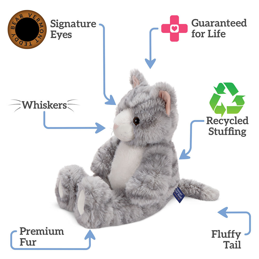 The perfect gift for the cat lovers in your life! From the thread whiskers to the fluffy tail, our 18' Kitten is a super-soft cuddle companion. Designed for fun adventures or curling-up for a cat nap, this Kitten is great for kids ages 1-100. Made with premium fur and stuffed with love in Vermont using 100% recycled stuffing. Guaranteed for life.