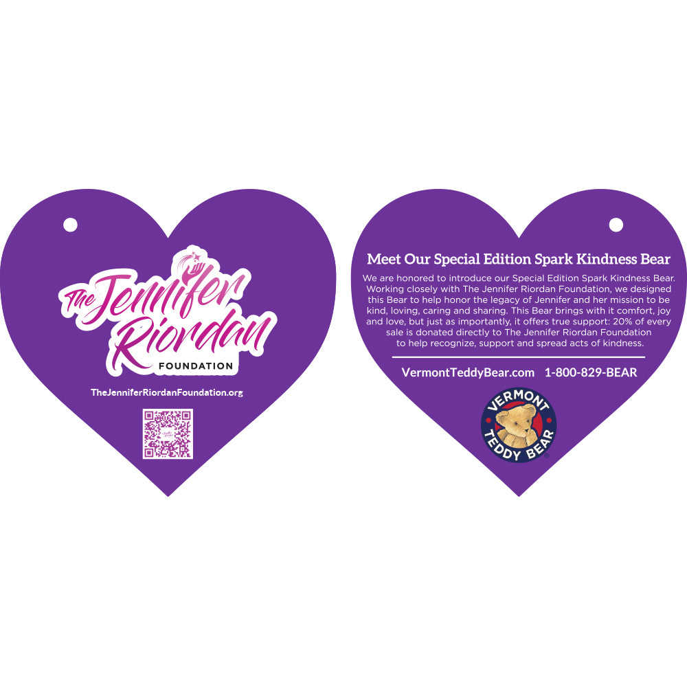 Join us in supporting the Jennifer Riordan Foundation with this custom-designed, Spark Kindness Bear. This 18' Super Soft huggable Teddy Bear wears a white t-shirt with the Jennifer Riordan Foundation's signature purple heart, the Foundation's logo on the sleeve, and Jennifer's core values reminding us to always be Kind, Loving, Caring and Sharing #KLCS. Stuffed with love in Vermont, USA using 100% recycled stuffing. Guaranteed for life.