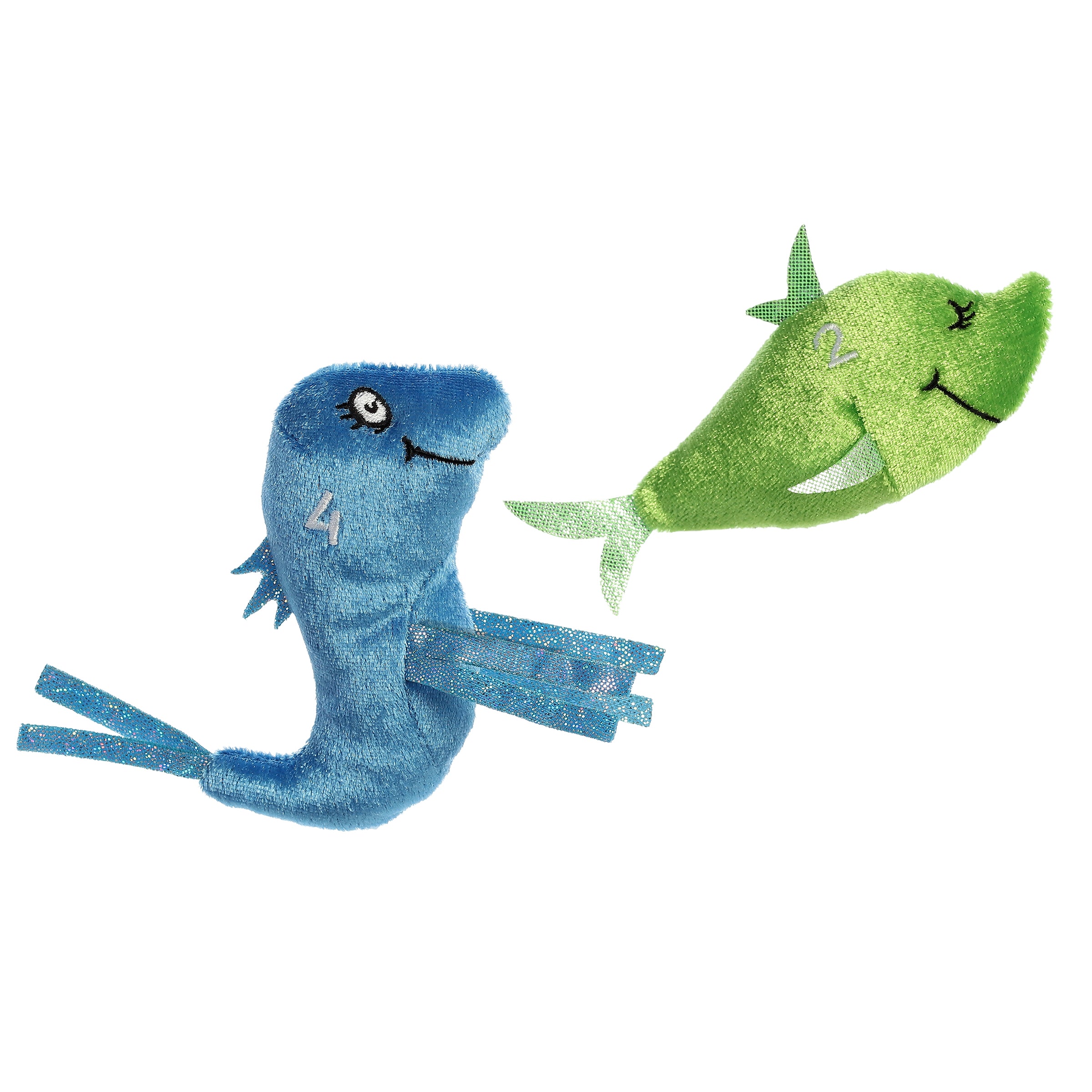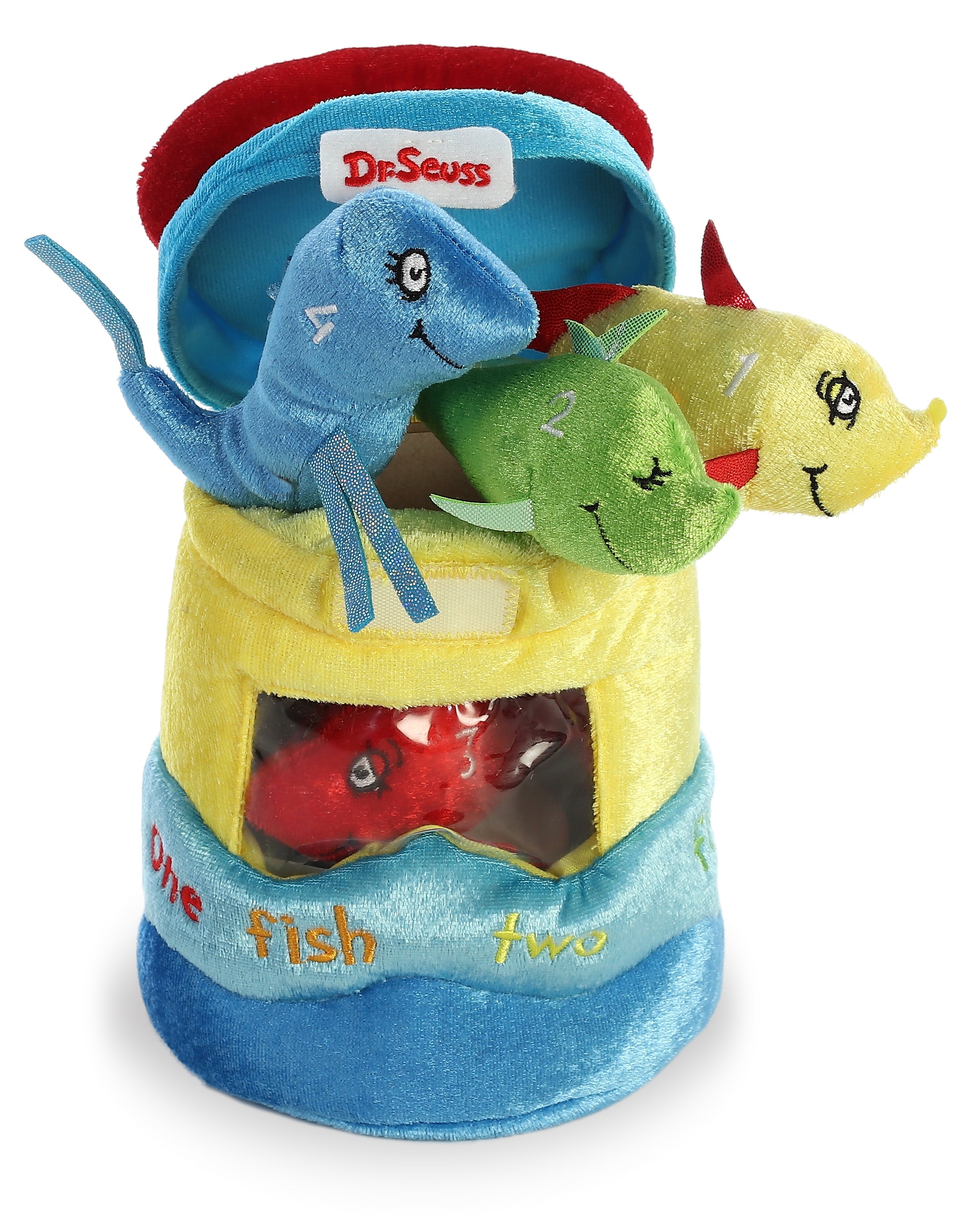 From the Dr. Seuss classic children’s story, One Fish, two fish, red fish, blue fish, the school of fish are now available in an adorable playset! Within a colorful plush carrier, there are 4 different colored fish with embroidered numbers and unique sound components like a rattle, bubble and squeaker, and crinkle fabric.