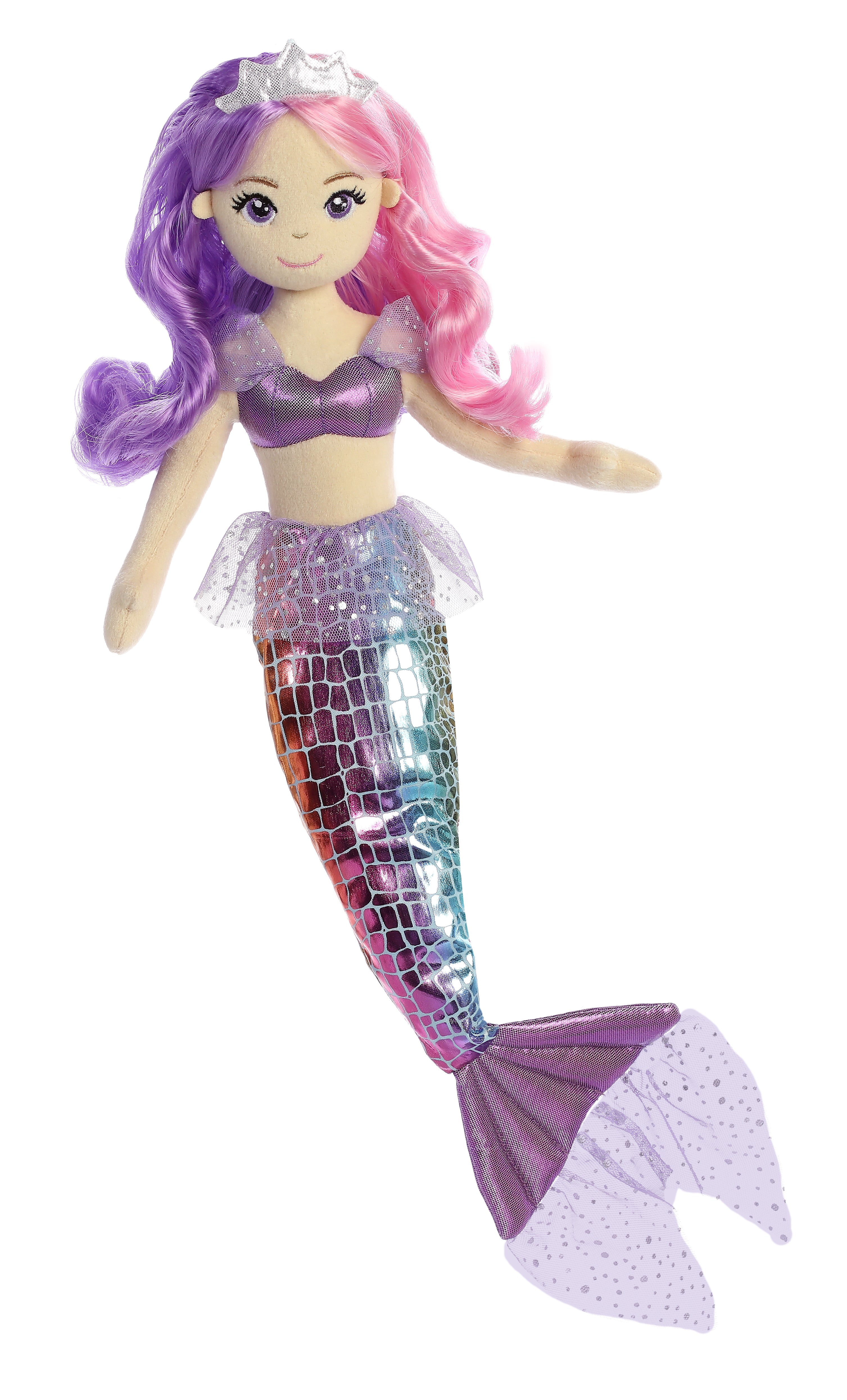 Sea Sparkles from Aurora feature a stunning array of beautiful mermaids and sea creatures! Sea Iris from Sea Sparkles is pink and violet themed featuring an extravagantly designed tutu outfit and matching violet sequined tail. This mermaid doll has half pink and half purple wavy hair with a silver crown.