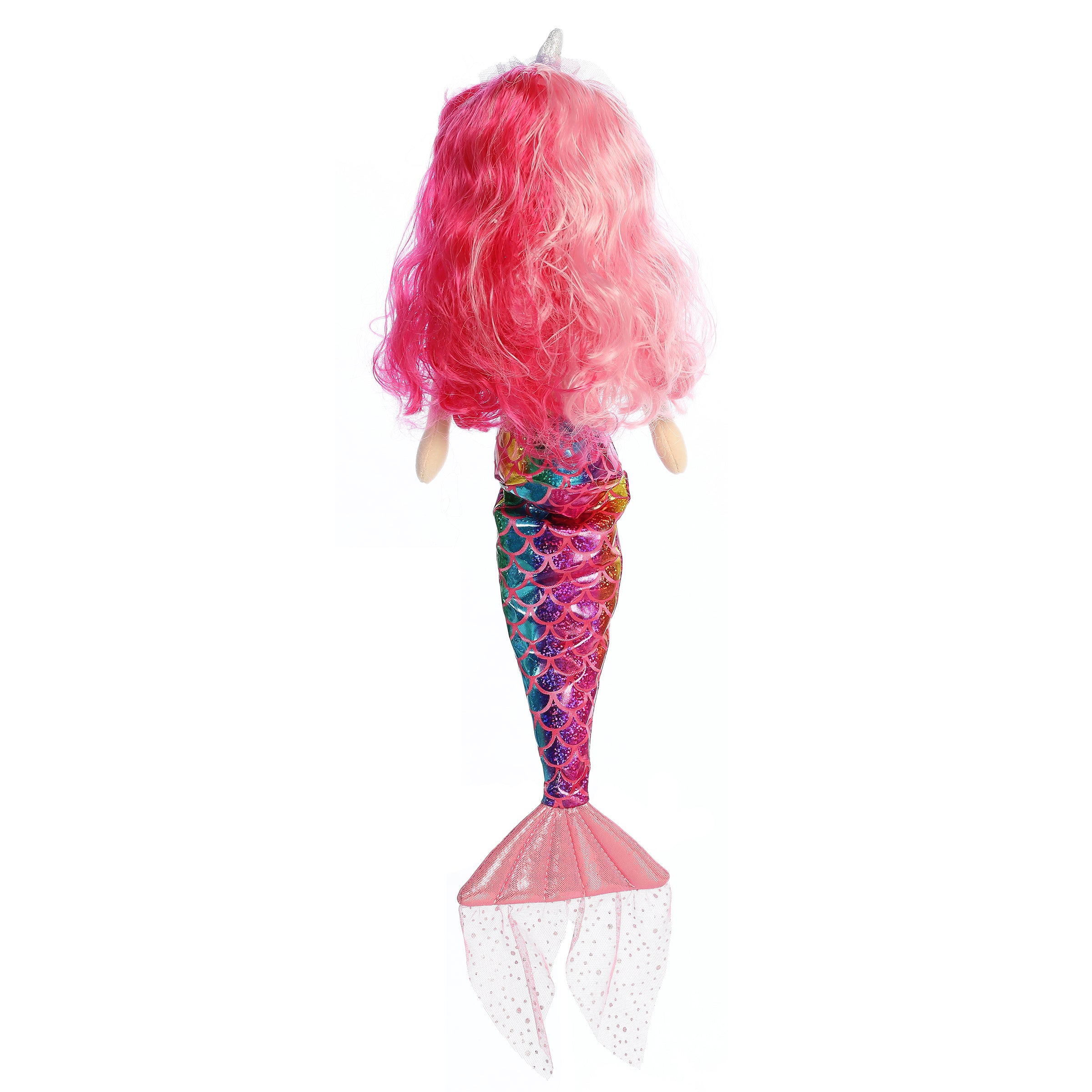 Rainbow Unicorn Sparkles from Sea Sparkles feature doll hair with mylar duo-toned hair you can comb! Minnie is a mermaid with light pink and hot pink hair, a gorgeous shimmery rainbow tail, pink outfit, silver horn, and flower crown, and has big beautiful deep blue eyes.
