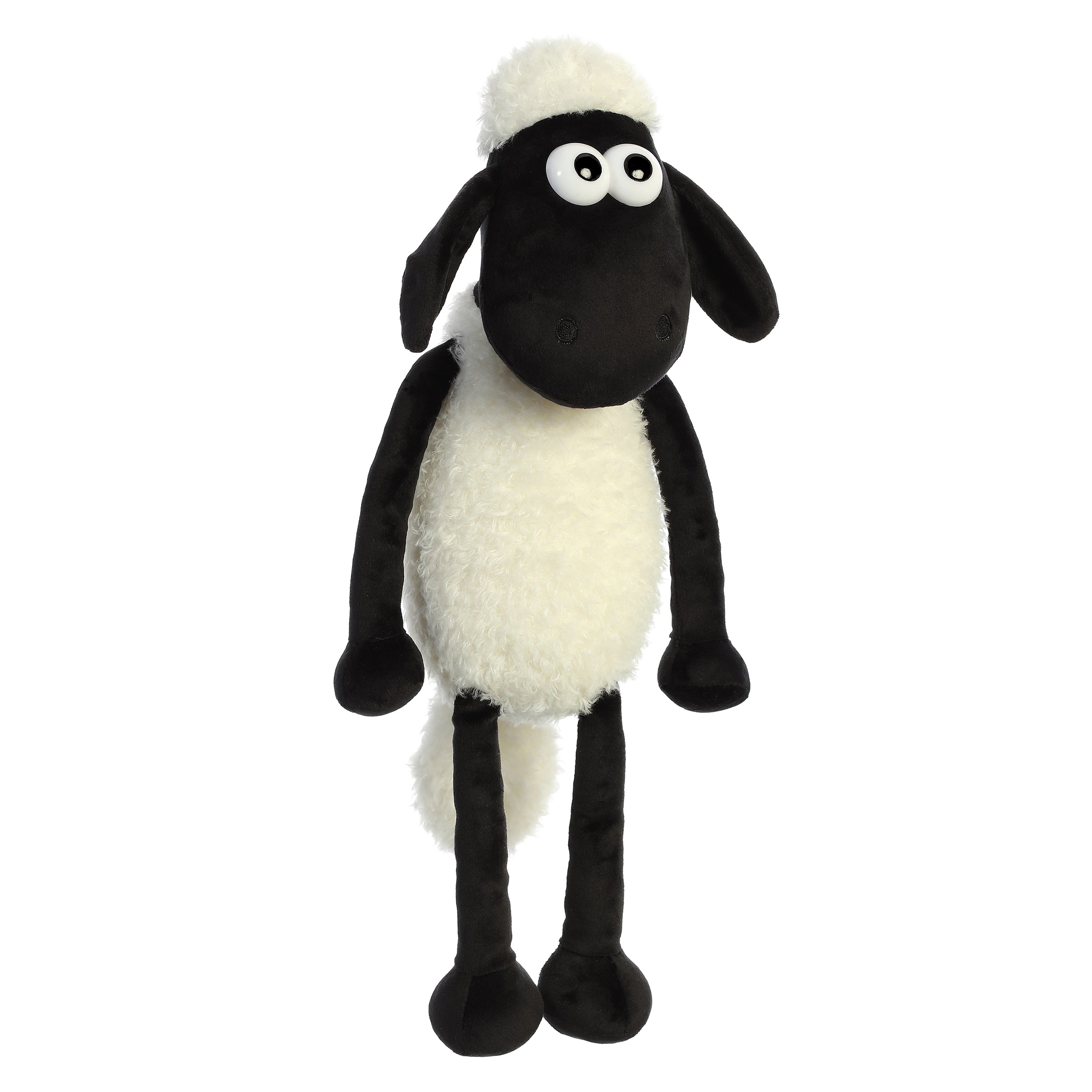Shaun the Sheep thinks and acts like a person in the barnyard. Shaun has his signature eyes, textured cream fur, and long black arms and legs