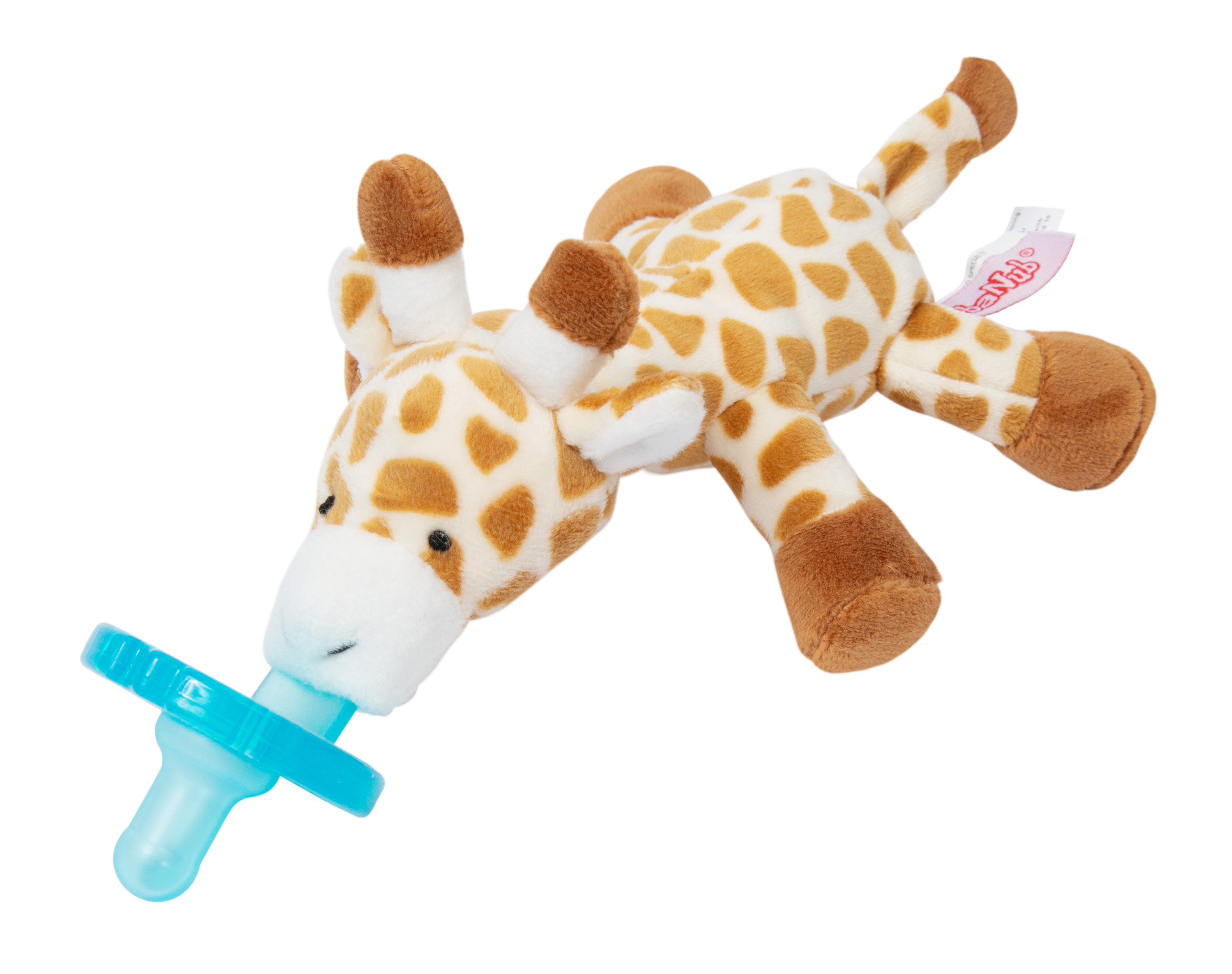Attached to the plush Giraffe, celebrated for its gentle and friendly nature, the unique style of the WubbaNub pacifier allows it to remain close and easily positioned by the baby. Easy to grasp, nearly impossible to lose and may assist baby to self soothe.