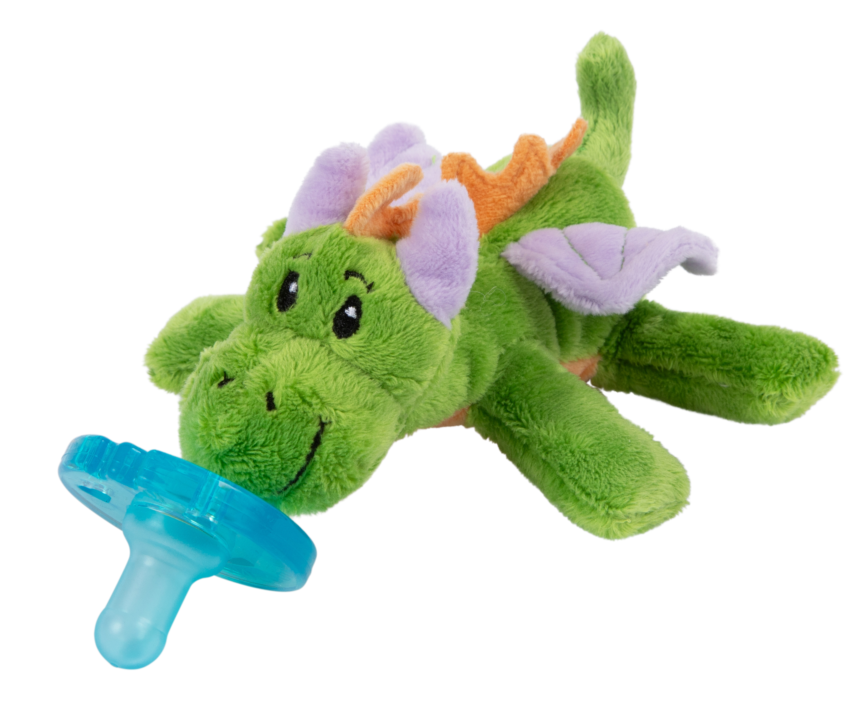 Attached to the plush Fairytale Dragon, the unique style of the WubbaNub pacifier allows it to remain close and easily positioned by the baby. Easy to grasp, nearly impossible to lose and may assist baby to self soothe.