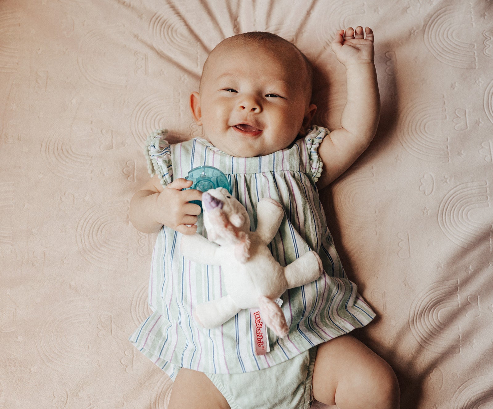 Collect the officially licensed WubbaNub Unicorn pacifier plush combo, a magical creature that has trotted in from afar to become your baby's first friend. Adorned in sherbet colors with little legs perfectly sized for tiny hands to hold, this Unicorn is ready to embark on sparkly adventures with your little one.